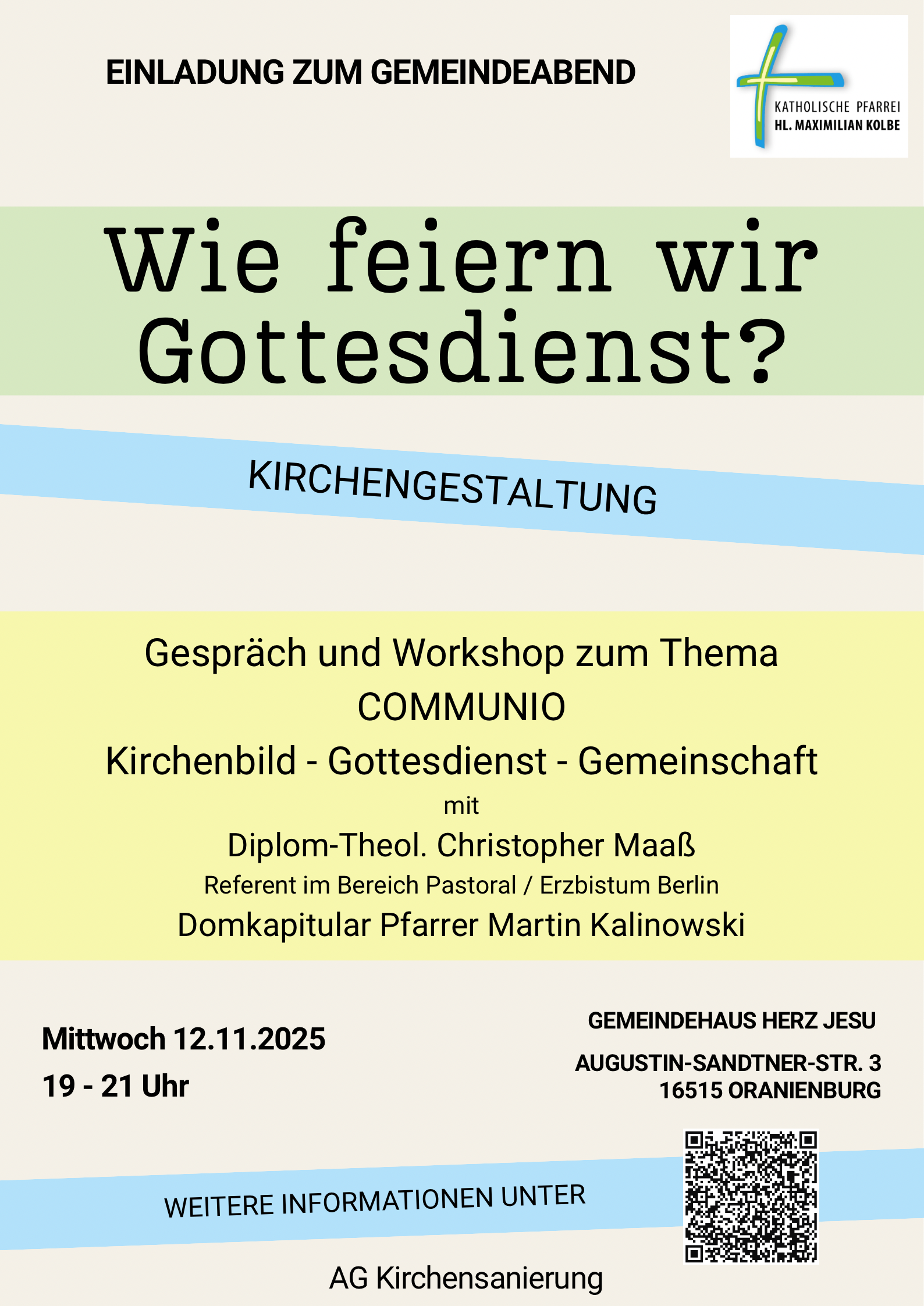 Ort: Katholische Pfarrkirche Herz Jesu Oranienburg, Augustin-Sandtner-Straße 3, 16515 Oranienburg