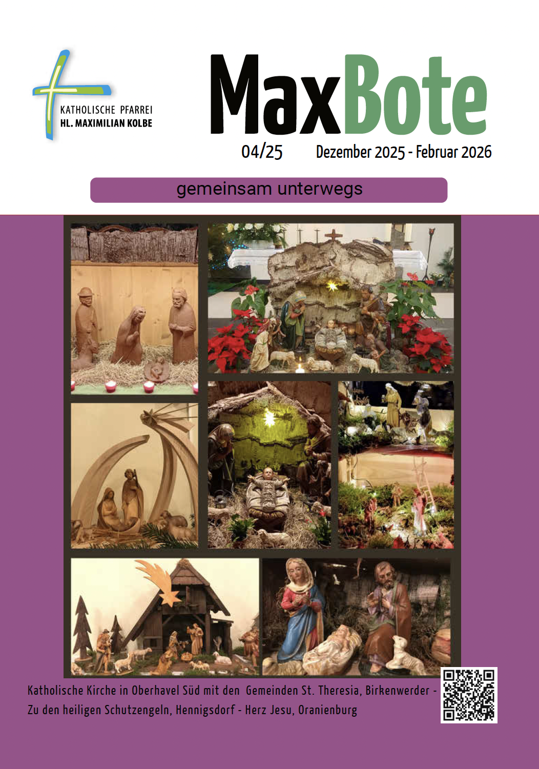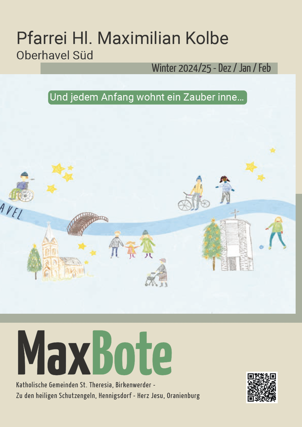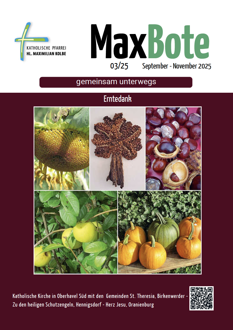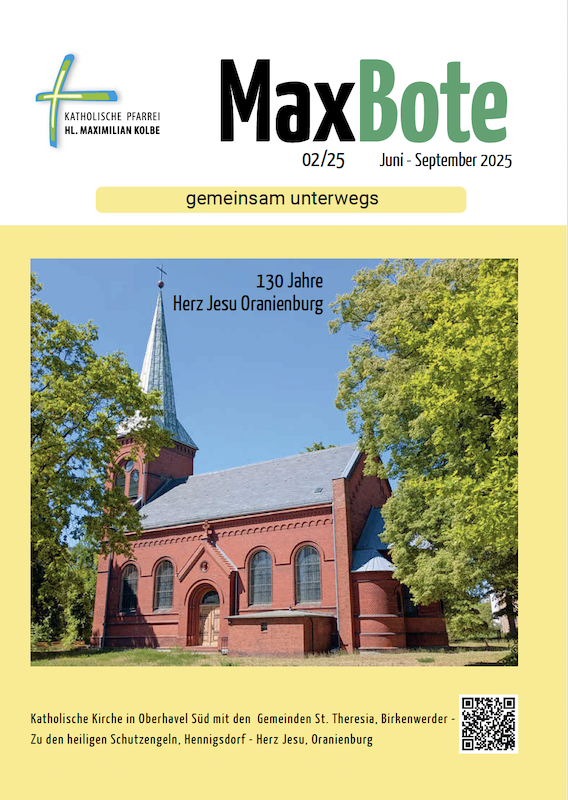 Der MaxBote ist der Pfarrbrief für die Pfarrei Hl. Maximilian Kolbe. Er fasst die Informationsschriften der bisherigen Gemeinden zusammen und informiert über die vergangenen und zukünftigen Aktivitäten der Gemeinden und der Pfarrei. Der MaxBote liegt in unseren Kirchen zum Mitnehmen aus, er ist hier auch online verfügbar. Der MaxBote erscheint jeweils zum 1. März, 1. Juni, 1. September, 1. Dezember.